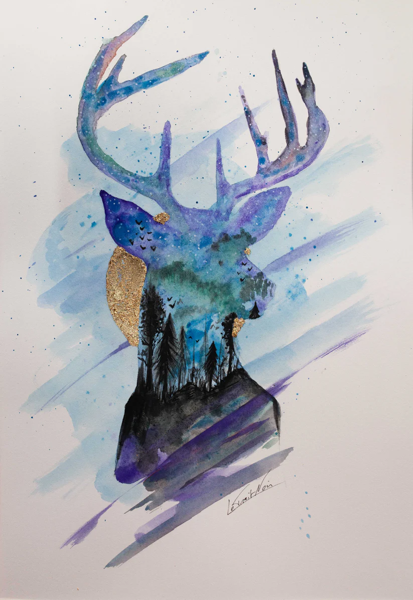 Je vous invite à vous perdre, le temps d’un regard, dans cette danse céleste du cerf. Une odyssée aquarellée qui, je l’espère, saura toucher votre âme autant qu’elle a touché la mienne lors de sa création.