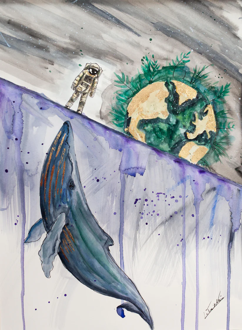 Découvrez une œuvre d’art remarquable, où l’exploration spatiale se marie avec la majesté des océans. Ce tableau captivant présente un spationaute observant une baleine, tandis que la Terre, ornée de feuilles d’or et de végétation luxuriante, se fond doucement dans l’horizon.