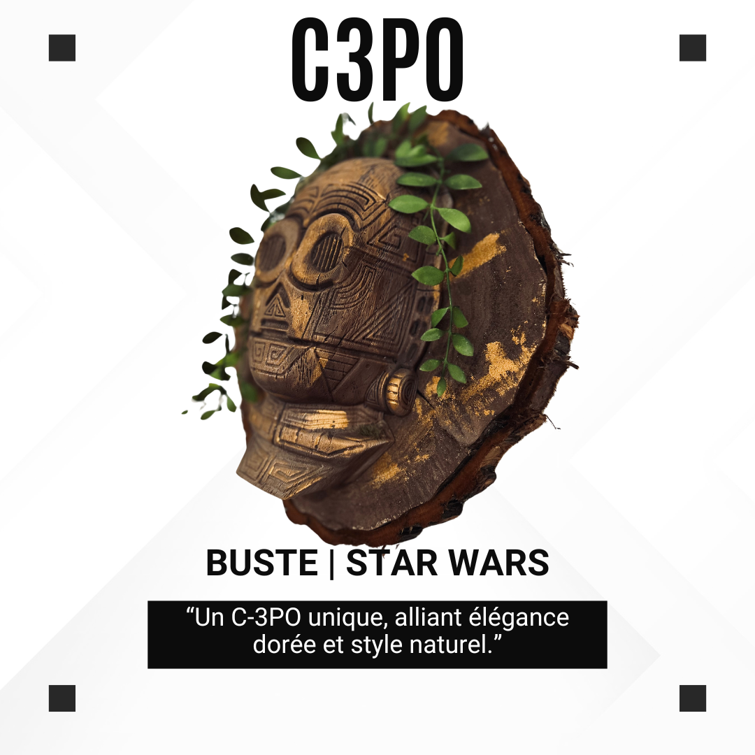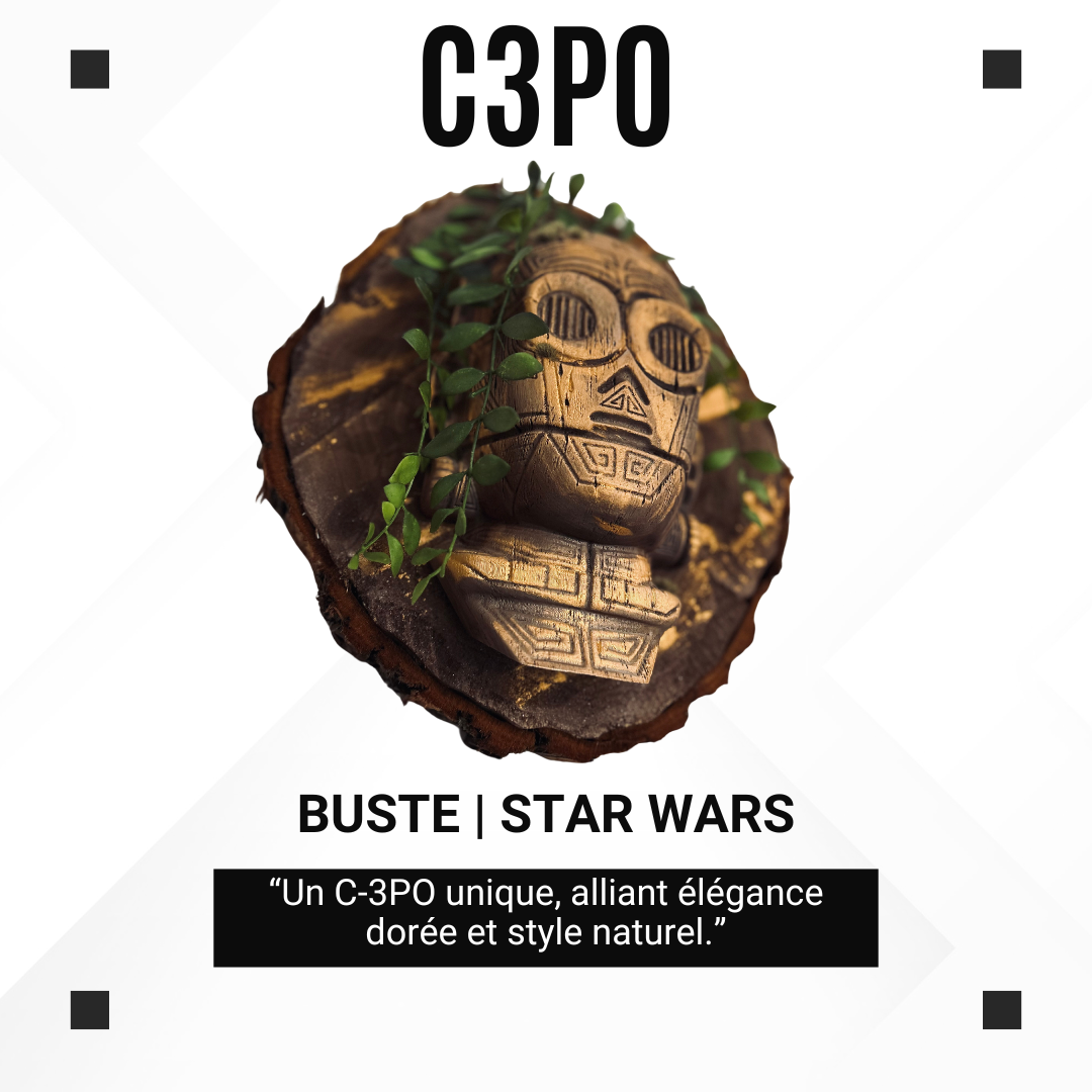 Apportez une touche unique et naturelle de Star Wars à votre collection avec cette tête de C-3PO en style sculpture sur bois. Inspirée du célèbre droïde, cette pièce originale est imprimée en 3D en PLA, avec une finition en brossage or qui accentue les détails du personnage tout en rappelant son aspect iconique. Montée sur un rondin de bois naturel et agrémentée de quelques fausses plantes pour un effet de verdure, cette création marie technologie et nature, donnant un style à la fois rustique et futuriste.